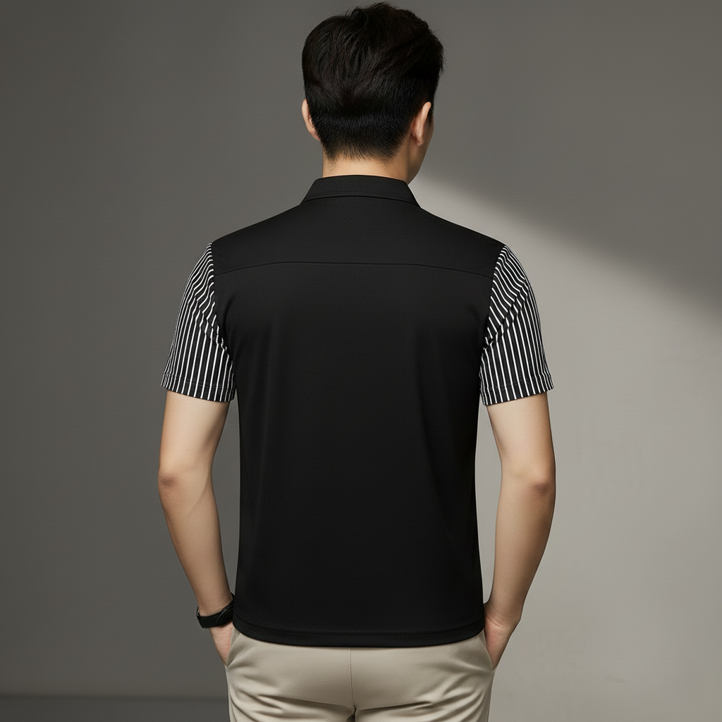 Men’s Black Polo T-Shirt with Striped Sleeves
